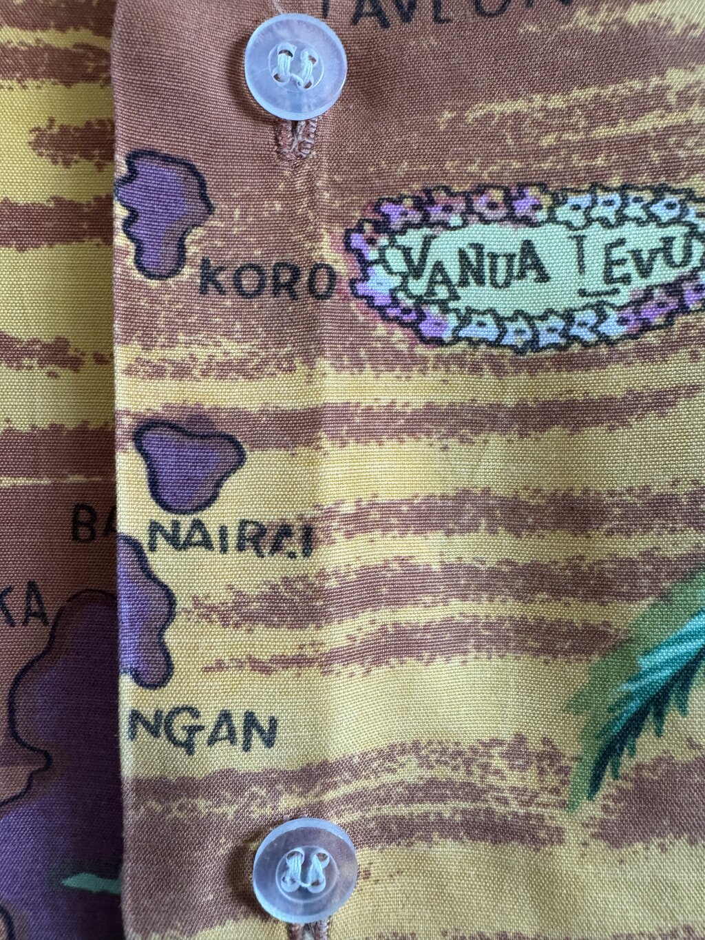 At just 26.5” in length, this shirt presents a boxy, vintage cut—ideal for collectors or stylists looking to add rare South Pacific cartography to their wardrobe. Despite visible wear, its vibrant palette and cultural storytelling make it a highly collectible survivor from the golden age of Hawaiian shirtmaking.