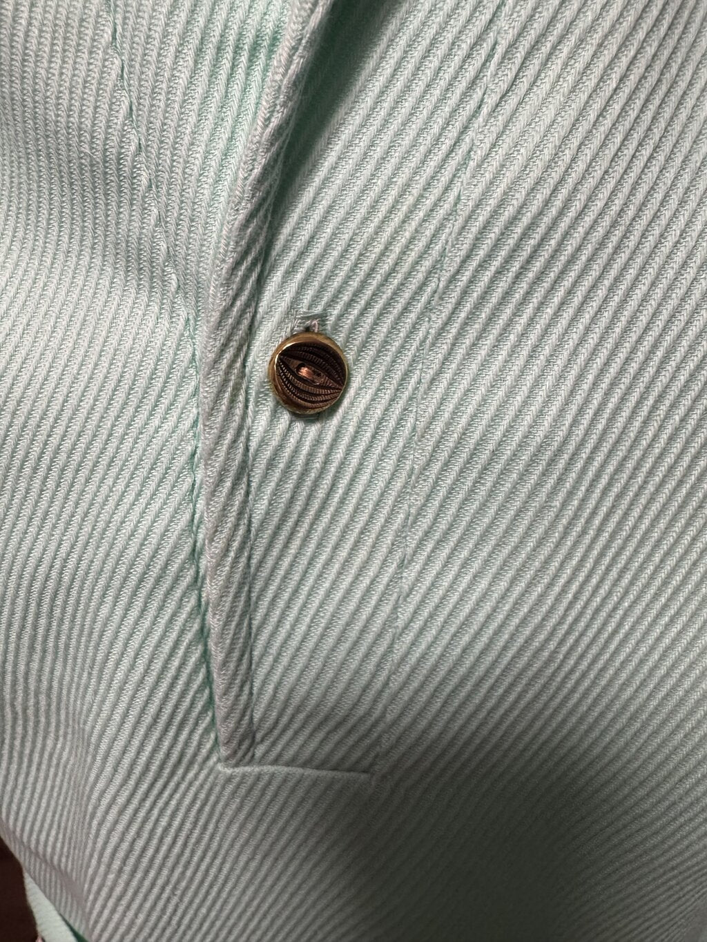 The build is unmistakably vintage. It features a single metal button at the chest, a sharp one-piece collar, and a crisply tailored fit that speaks to its mod roots. The fabric is thick yet soft with a structured drape, giving it a polished presence that feels more like a designer piece than casual beachwear.
