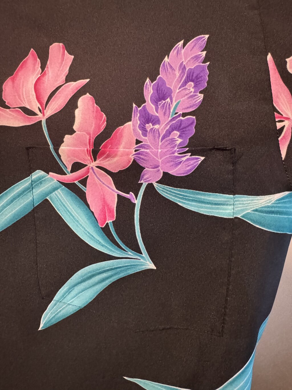 A rare find for collectors and bold-style aficionados: this 1960s Paradise Hawaii shirt, made in Honolulu, delivers a stunning statement in both size and visual impact. Cut from a sleek, lightweight fabric with a subtle sheen, it showcases a luxurious arrangement of orchid-pink lilies, lavender blooms, and vivid bird of paradise flowers dancing across a jet-black backdrop.
