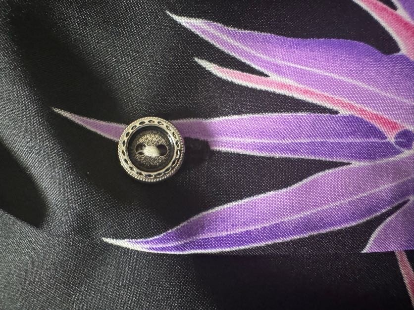 Notable construction details include a crisp two-piece collar, smooth plastic-metallic buttons, and a button loop top closure, enhancing its tailored silhouette. Two lower buttons have been replaced with similar lookalikes - tastefully done, and almost indistinguishable unless you inspect closely.