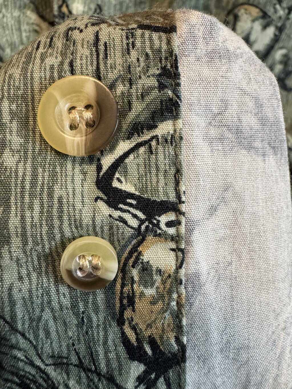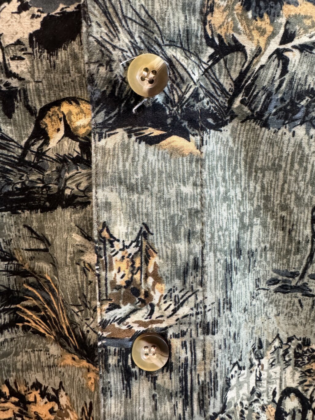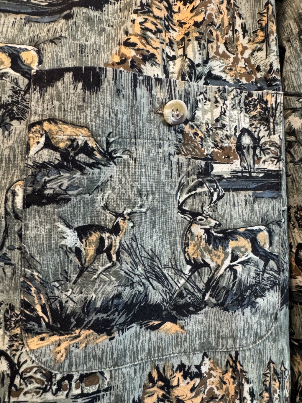 This 1970s Field & Stream shirt channels a rugged yet tropical aesthetic with its moody, earth-toned floral print—featuring deep greens, brown foliage, and cream accents that blend like dappled sunlight through jungle canopy. The rayon-poly blend fabric is feather-soft and drapes naturally, lending it a relaxed island silhouette with vintage durability.