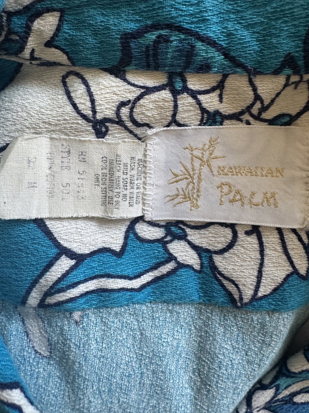 This 1970s Hawaiian Palm shirt is a standout piece for collectors who appreciate bold contrasts and rich fabric texture. Cut from a thick crinkle cotton with a dry handfeel, it showcases a sweeping floral arrangement in saturated navy and cream across a brilliant turquoise ground.