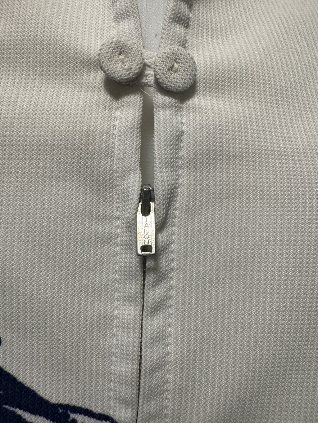 From the sharp navy-on-white palette to the rare zippered front and era-specific construction, this piece is an exceptional survivor from a golden period in Hawaiian fashion. Highly collectible and rarely offered in this condition.