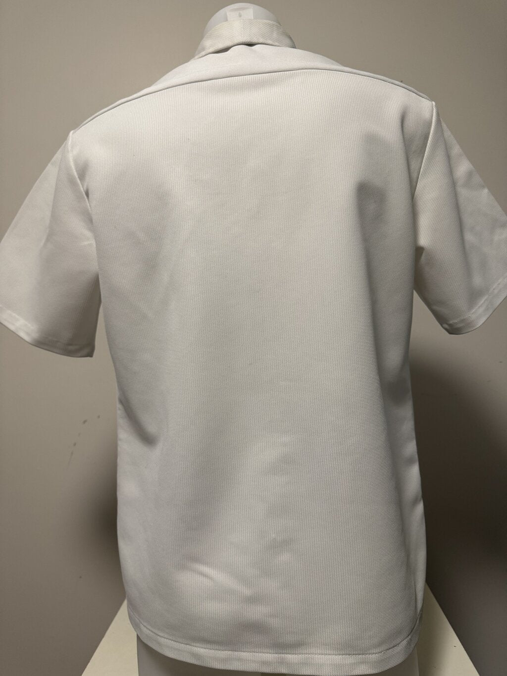 Distinctive tailoring details elevate its appeal: a two-piece collar with gentle flare, button-tab top closure, and a concealed Talon zipper running clean down the center. The welt chest pocket is sewn with precision, its alignment flowing seamlessly into the artwork. Finished with single-needle stitching and a flat hem, this shirt balances crisp structure with relaxed summer style.