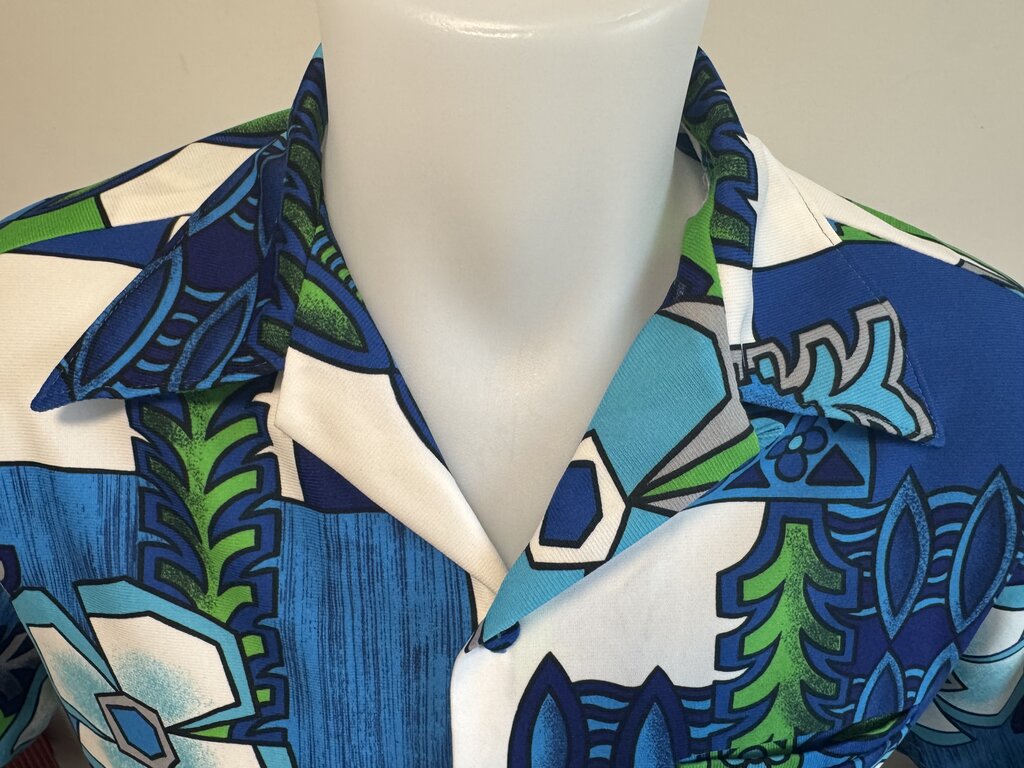 Step into the bold brilliance of 1970s Aloha wear with this electrifying Malihini Hawaii button-up, crafted in a soft and vibrant polyester knit. Drenched in rich oceanic blues, crisp whites, and punchy greens, the print is a geometric tapa-inspired explosion—featuring oversized hibiscus forms, tribal diamonds, and mirrored leaf motifs outlined in black.