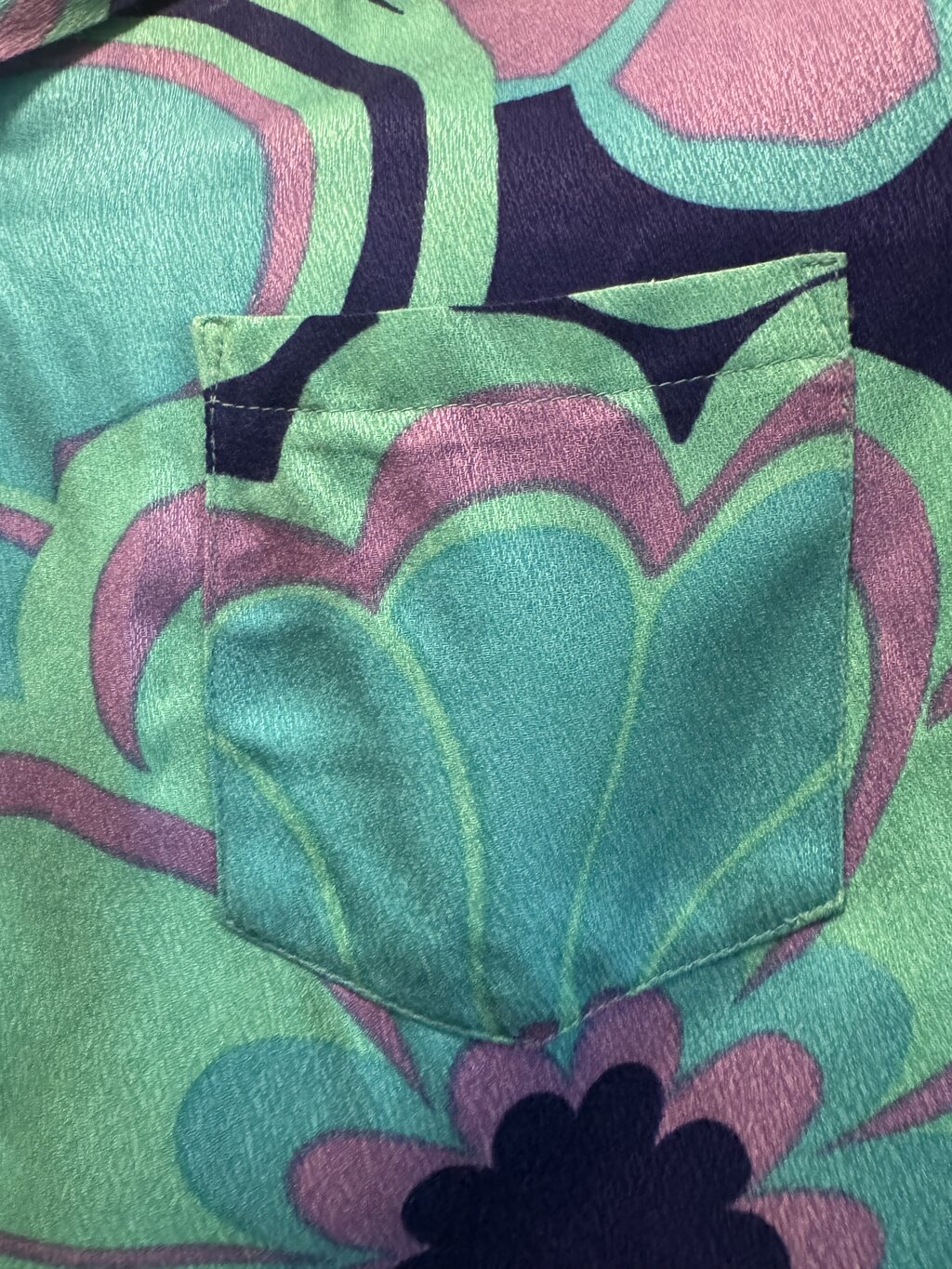 This bold and silky Mei Jan button-up captures the essence of late 60s/early 70s psychedelia with unapologetic flair. Swirling in oversized abstract florals, the print commands attention with an electrifying blend of cerulean, deep navy, and lavender—layered over soft rayon that drapes like a dream.