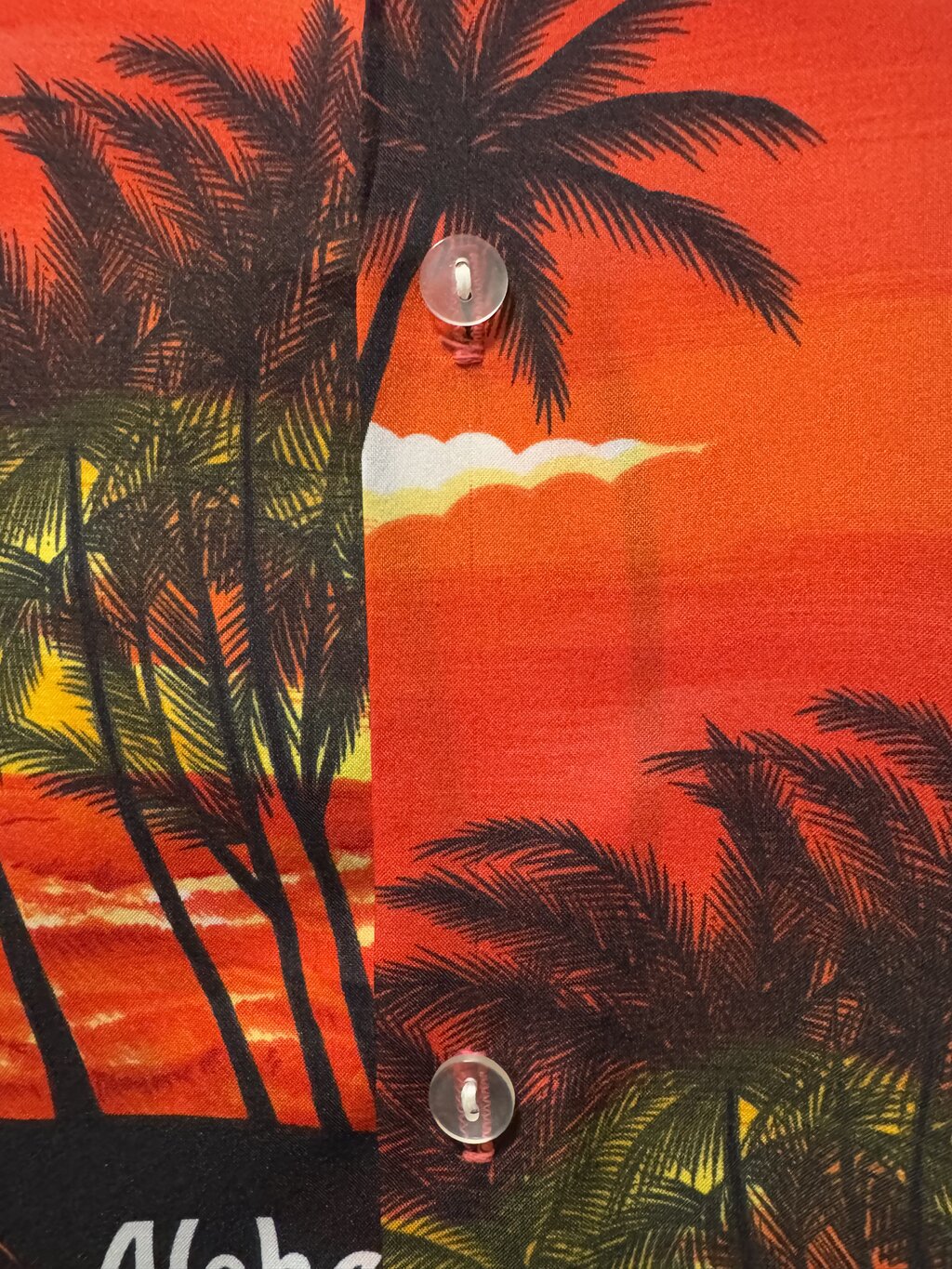 Radiating the fiery glow of a Hawaiian sunset, this Royal Princess Aloha shirt captures the dramatic silhouette of palms swaying against a bold gradient of crimson, gold, and volcanic orange. The silky polyester construction offers a smooth handfeel and lightweight drape, perfect for warmer weather or layering under a jacket.