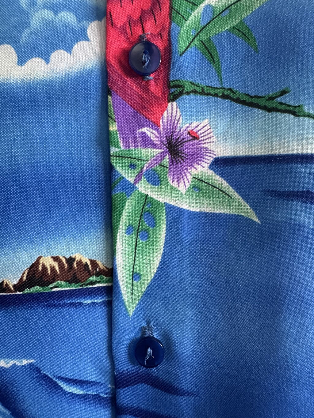 Catch the wave of retro island cool with this bright ocean-blue aloha shirt from Casual Wear, made in Hawaii in the 1980s. Vividly screen-printed with a panoramic surfing scene, the shirt features curling pipeline waves, Diamond Head in the distance, soaring parrots, palm trees, and a lone surfer mid-ride—framed by soft tropical blooms in orchid purple.