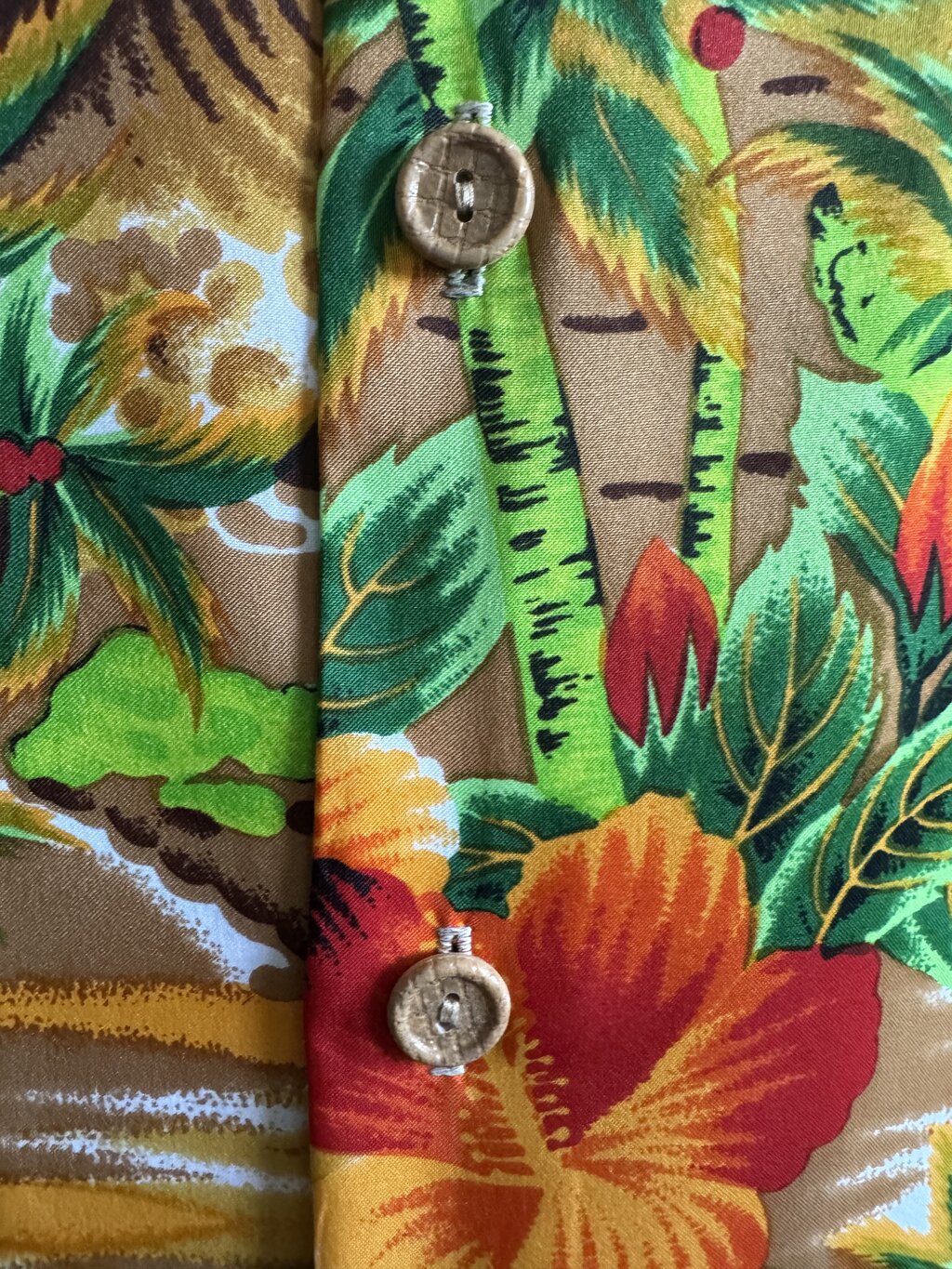 Saturated with island nostalgia, this 1980s Dolphin aloha shirt captures a vivid shoreline fantasy—lush with red-orange hibiscus, palm trees, crashing surf, and a yellow-red outrigger canoe set against an earthy brown and golden wave backdrop. The synthetic fabric has a signature silky finish, gliding against the skin with that unmistakable vintage sheen.