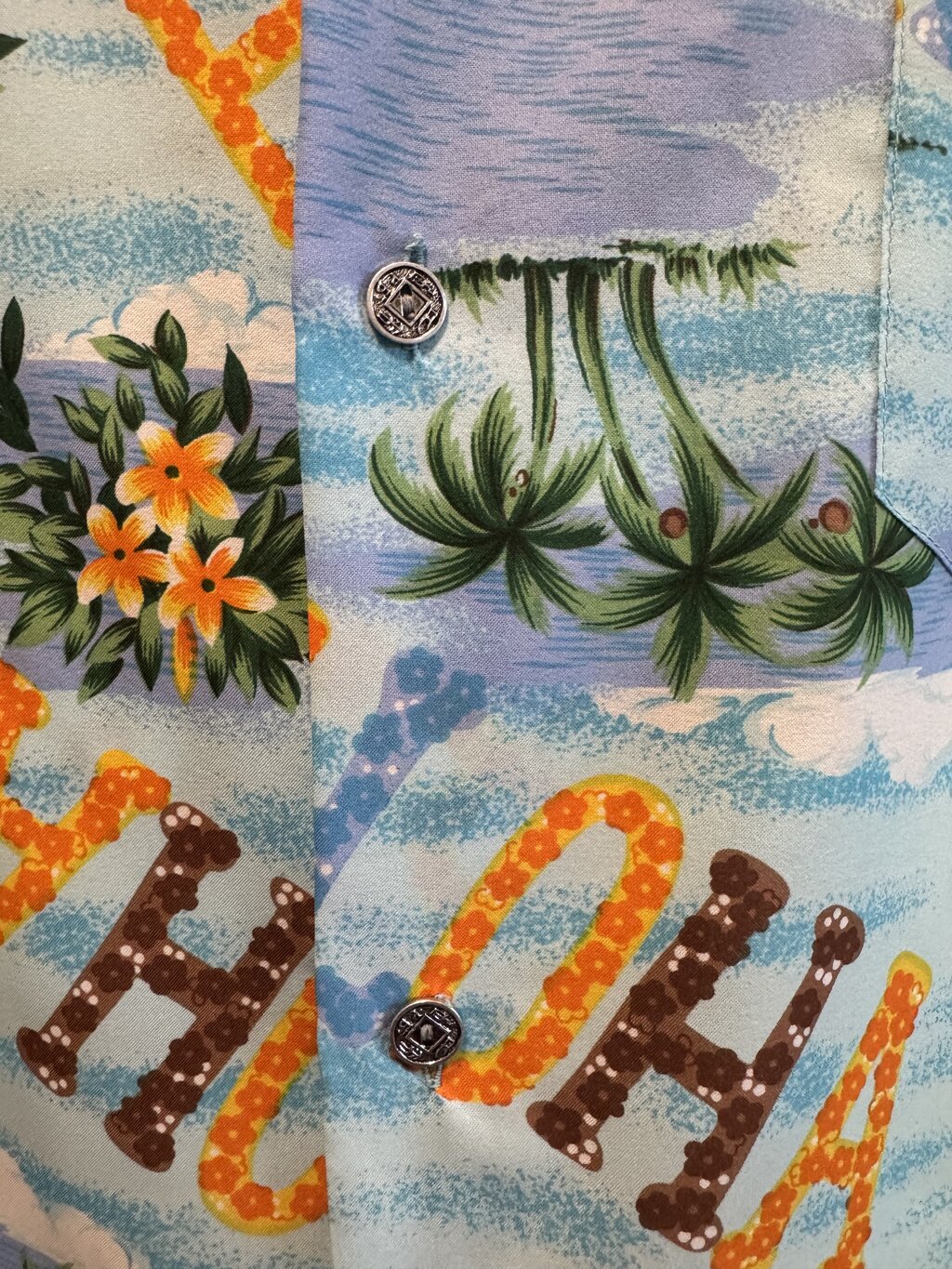 1980s “Made in Hawaii” Hibiscus & Diamond Panel Shirt – Sky Blue Rayon (M)