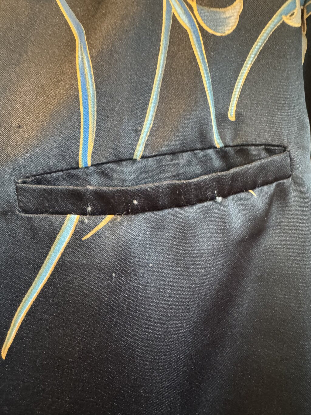 A refined example of 1980s aloha minimalism, this silky black Pacifica shirt dials back the chaos in favor of elegant restraint. Subtle but striking, its off-center layout features long, curling stems and blooming lilies in soft beige, slate blue, and muted gold—evoking a painterly, near-Japanese aesthetic rarely seen in Hawaiian shirt design.