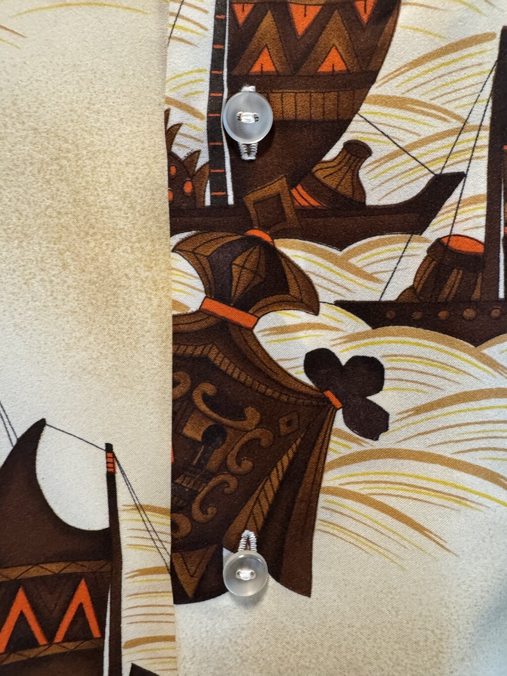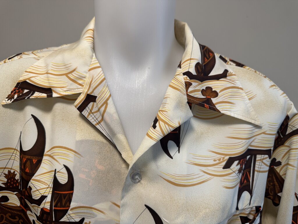 Crafted in the USA from soft polyester, the shirt has a fluid, lightweight drape and subtle sheen. Its construction includes a classic camp collar, opaque plastic buttons, single-stitch seams, and a welt chest pocket (with slight pattern misalignment—common in handmade aloha shirts of this era). The off-center layout emphasizes visual motion, while the scale and repetition of the canoes create a rhythmic visual flow.