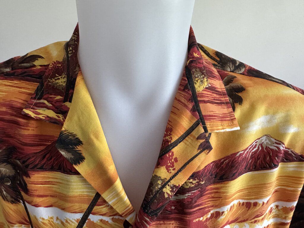 Step into the fiery glow of a Hawaiian sunset with this bold vintage shirt from Royal Creations, proudly made in Hawaii. Featuring a dramatic volcanic island scene awash in intense gradients of sunset gold, deep maroon, and crimson, this piece captures the raw heat and romance of the islands’ landscape.