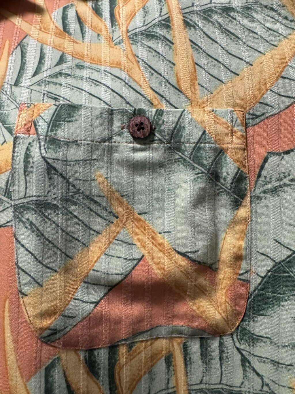 Style Notes: Off-center tropical foliage print, coconut shell buttons, camp collar, patch pocket (non-matched print), single-stitched seams, spare buttons, button loop