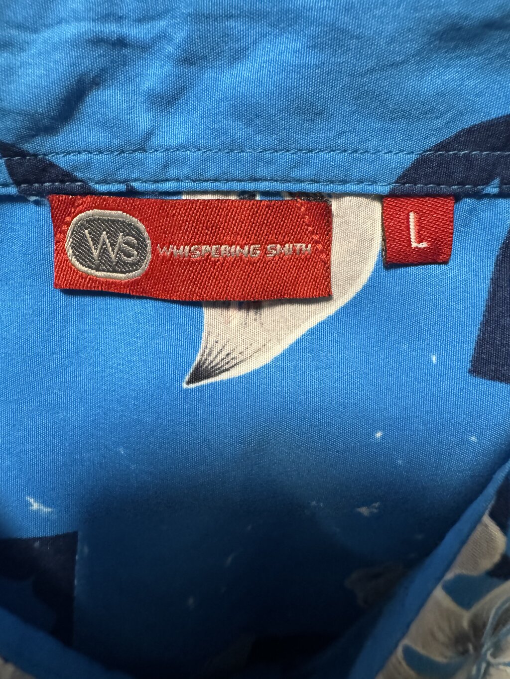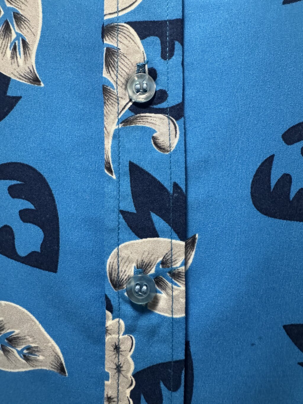 Style Notes: Two-piece collar, plastic blue buttons, off-centered print, no pocket, single-stitch seams, includes spare buttons