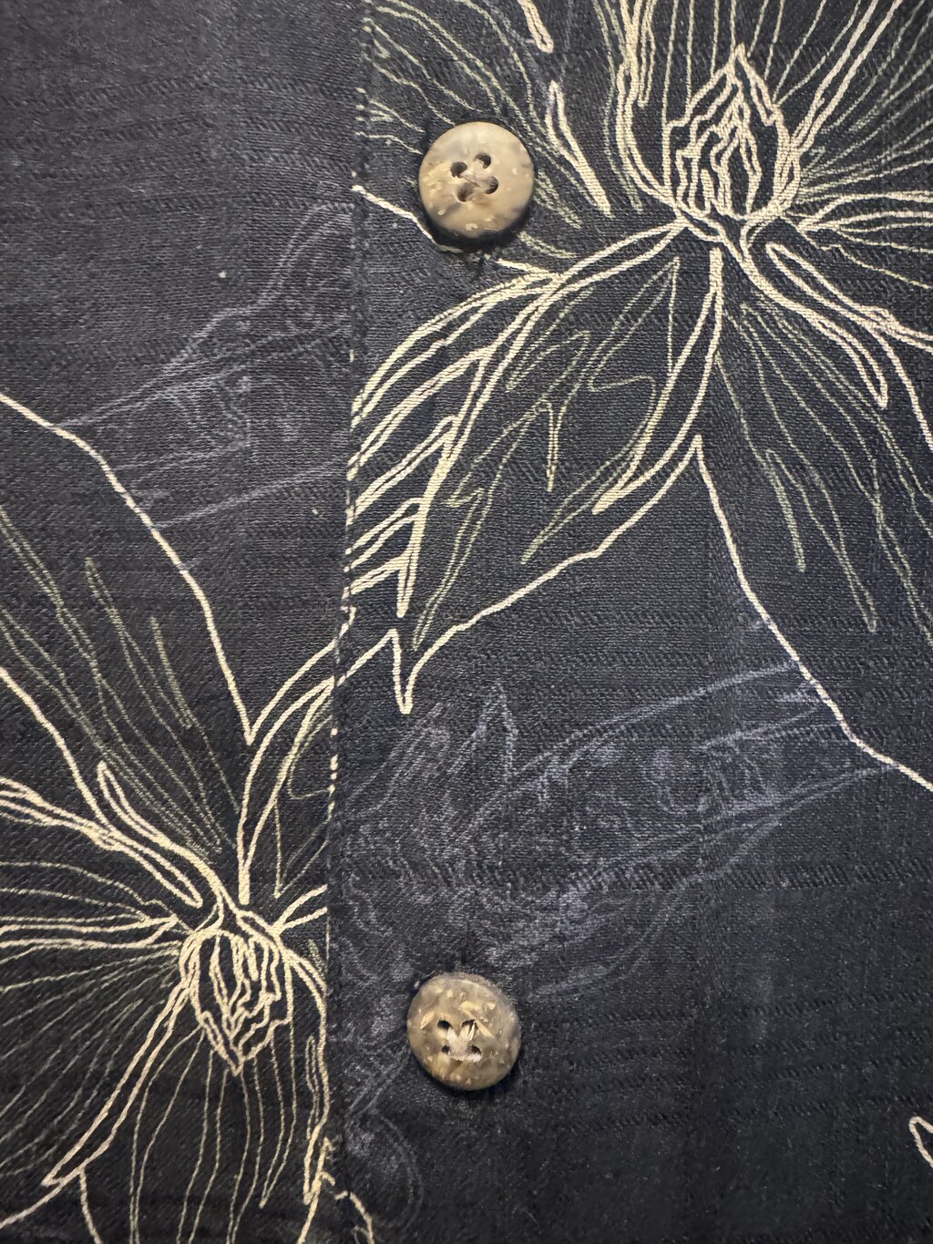 Style Notes: Monotone floral print with off-center layout, plastic brown buttons, one-piece collar, no pocket, single-stitch construction
