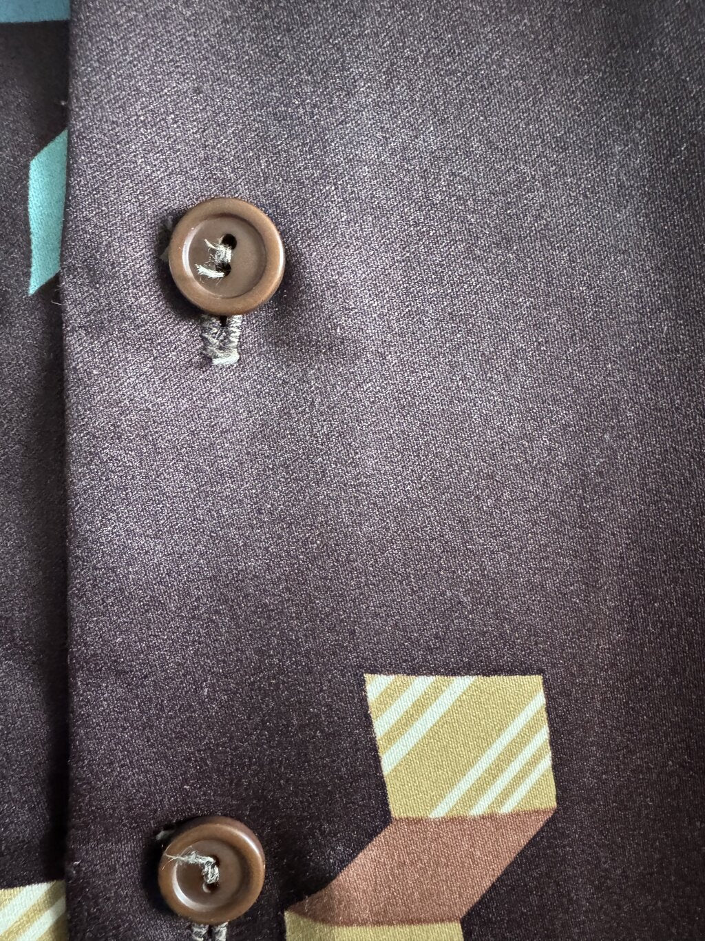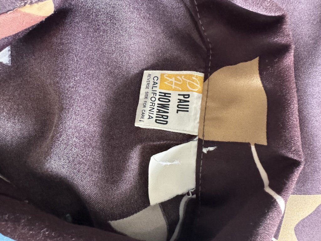 70s Paul Howard Abstract Geometric Hawaiian Shirt – Chocolate Satin with Blue & Gold (M)