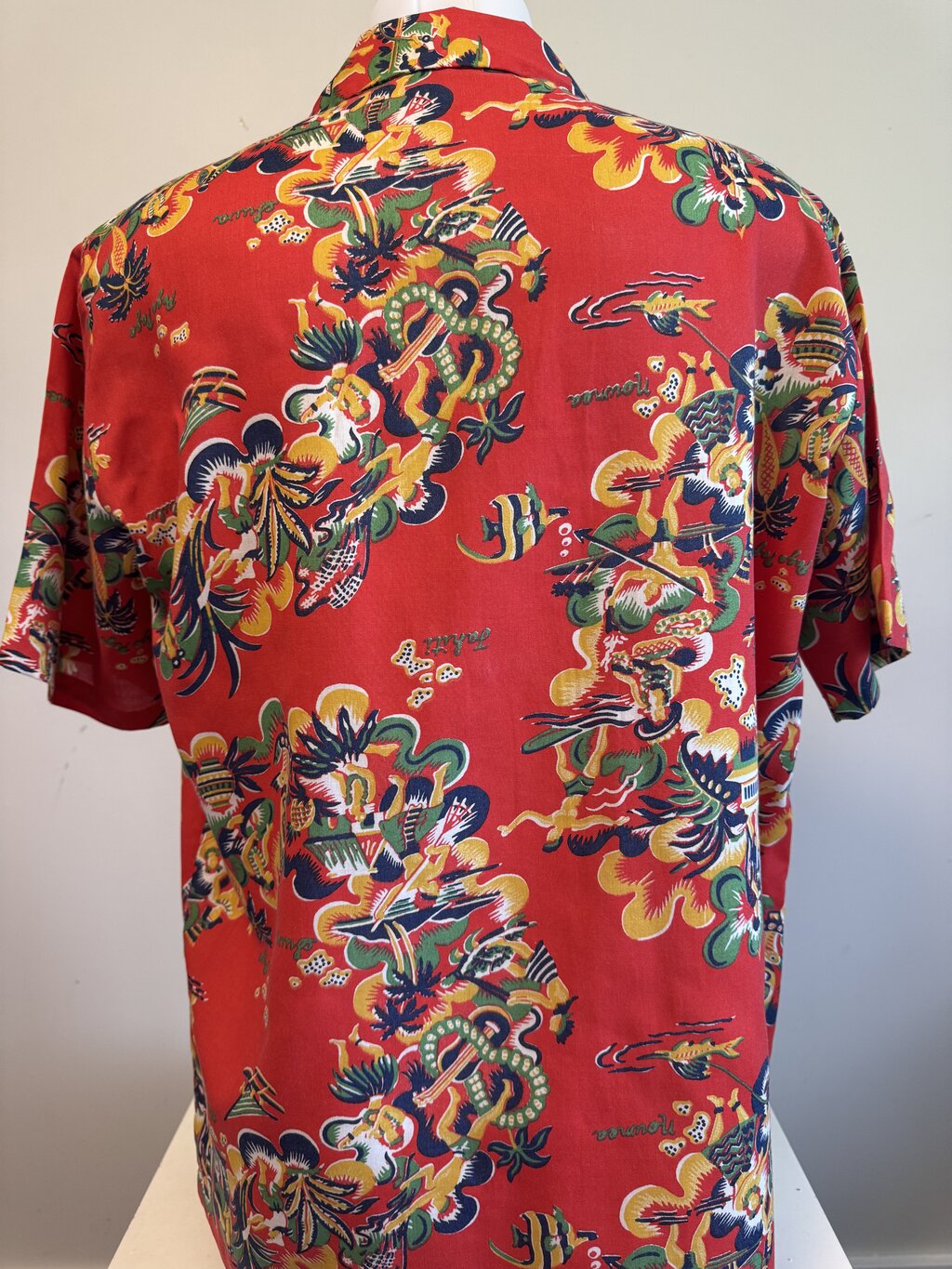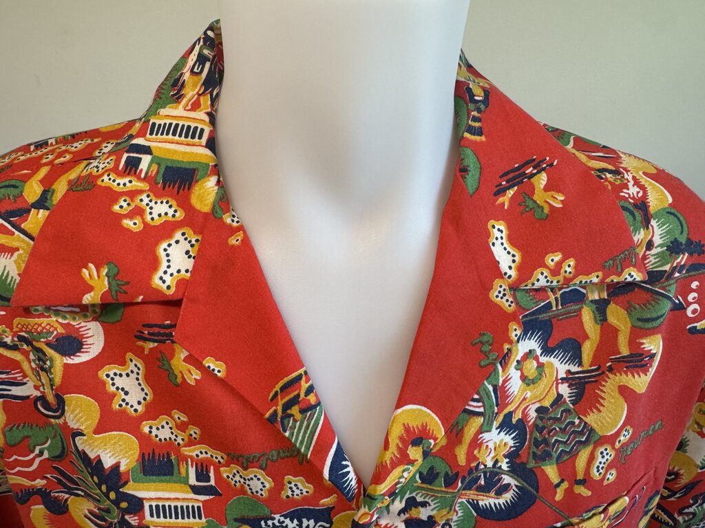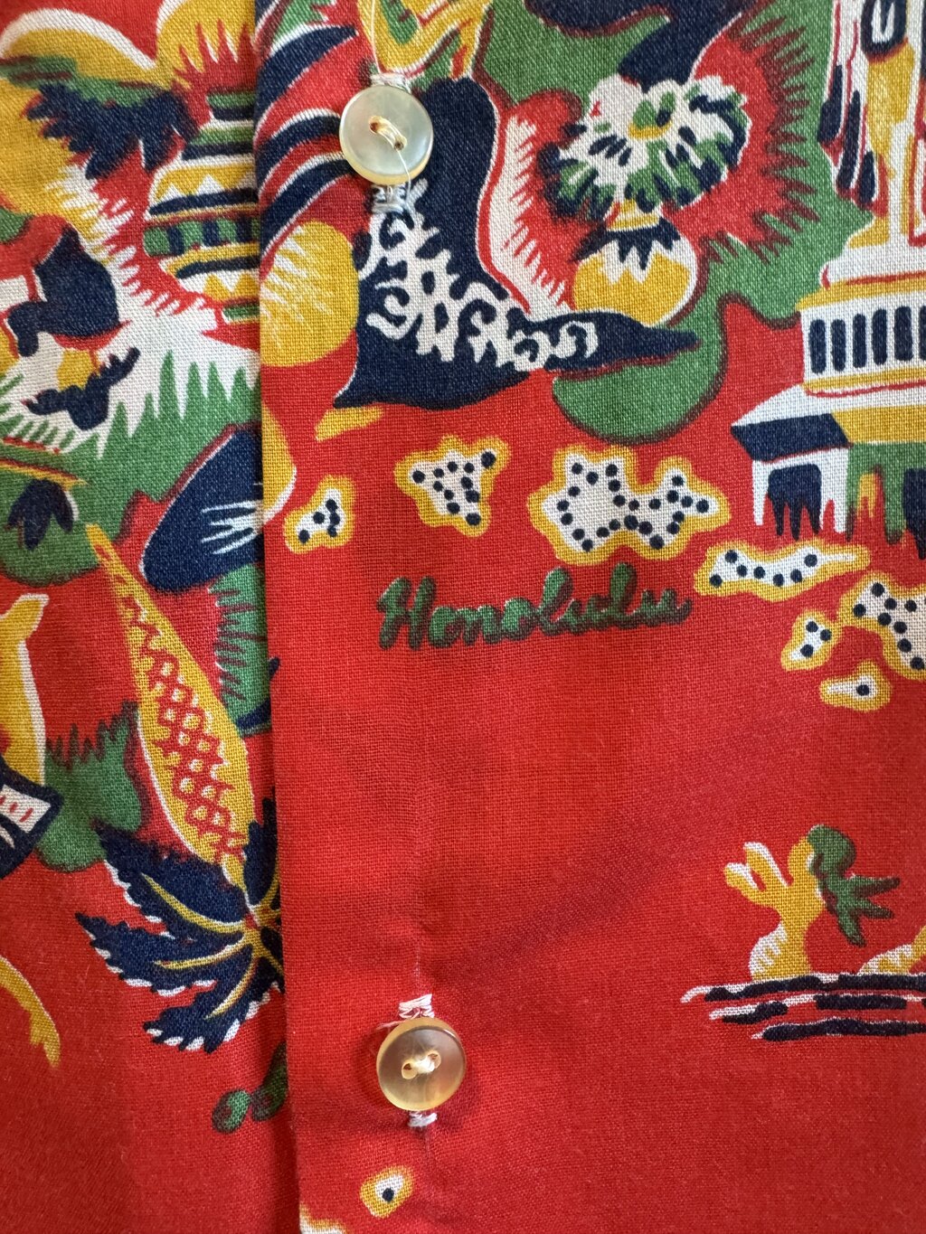 Don’t miss your chance to own this highly collectible mid-century Honolulu souvenir shirt—an archive-worthy example of Hawaiian textile artistry at its boldest.
