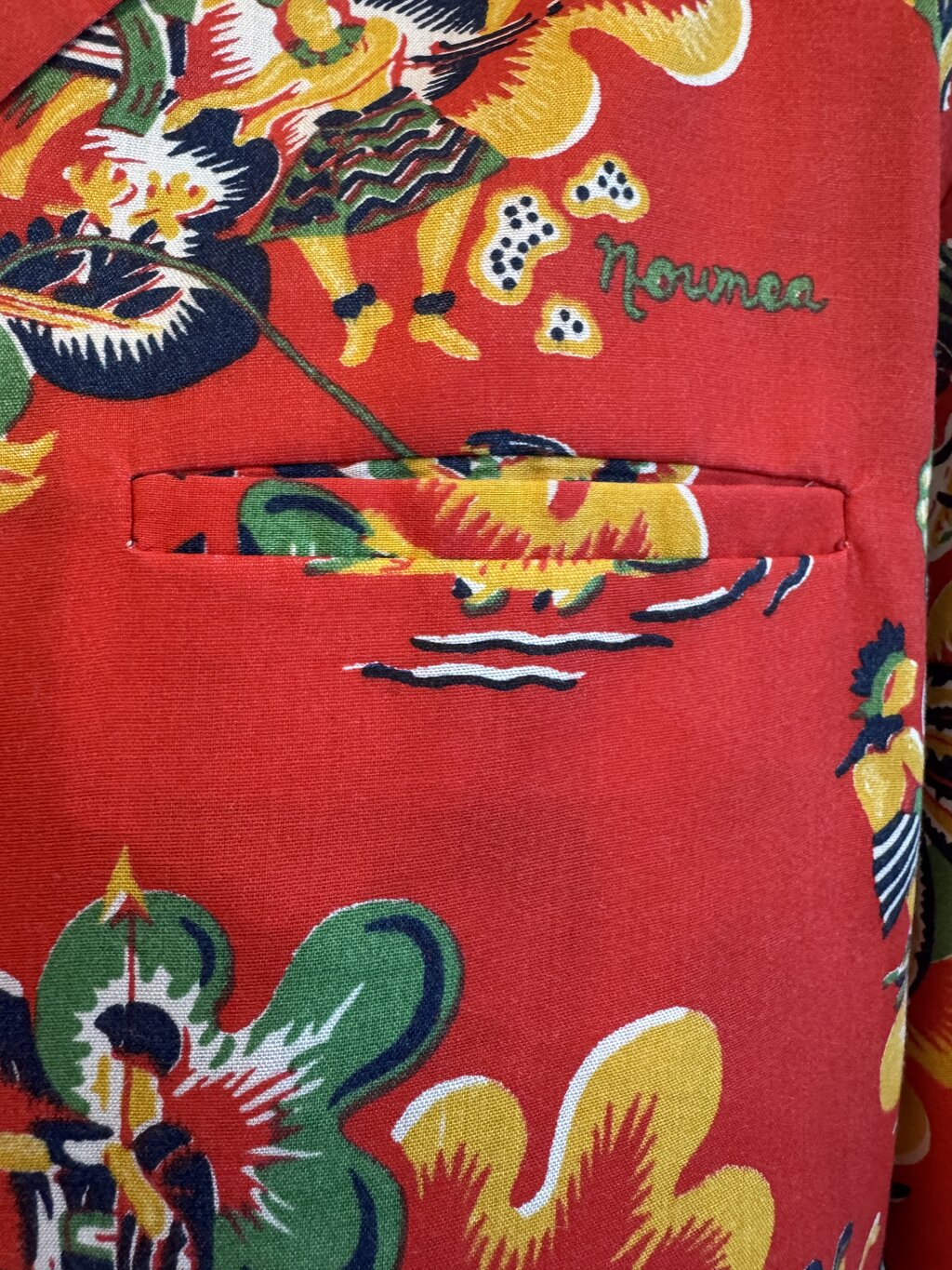 The fabric is a thick and durable 50/50 rayon-polyester blend, providing an ideal drape with just enough structure. A classic camp collar and welt pocket complete the silhouette, while mother-of-pearl-style plastic buttons add a touch of vintage polish. The pocket is slightly misaligned—a charming quirk often seen in hand-cut originals of the period.