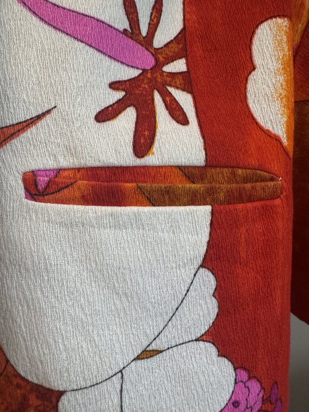 A blazing statement from the psychedelic edge of the Aloha era, this bold shirt channels the fiery vibrancy of late 60s textile design. Crafted from thick, textured cotton with a barkcloth-like handfeel, it showcases oversized hibiscus blooms in lava-toned oranges, deep reds, and vibrant purples, set against dramatic, off-center panels that ripple with heat and energy.