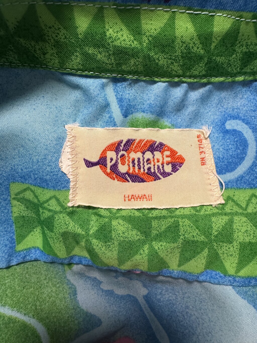 Step into the bold spirit of mid-century islandwear with this electric blue vintage Pomare shirt, a rare XL gem from the golden age of Hawaiian polyester. Created in the USA by Pomare and registered under Hilo Hattie’s RN 37145, this shirt fuses two signature motifs: lush hibiscus florals in fuchsia and green, and interlocking Polynesian geometric bands - a nod to both nature and heritage.
