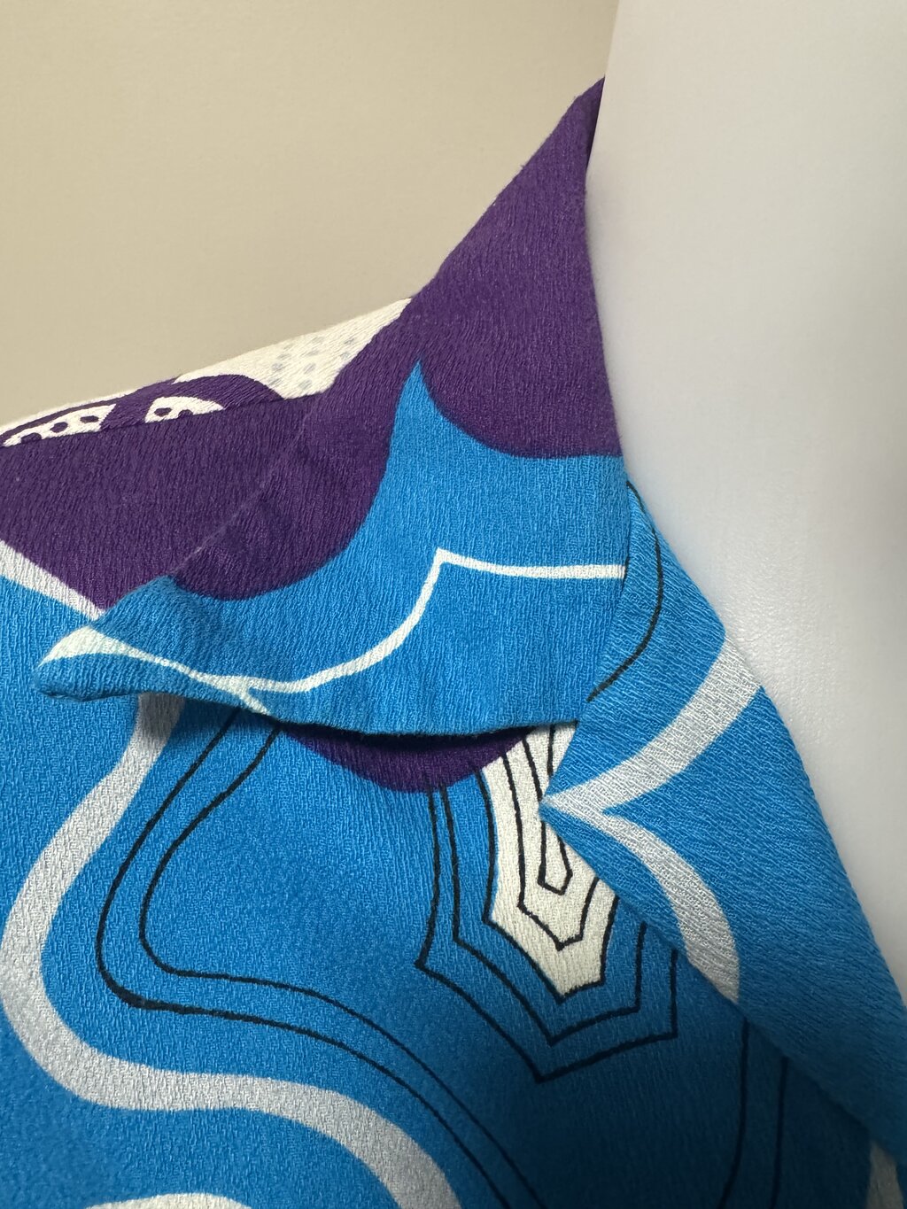 This piece is in excellent vintage condition, with no stains, damage, or fading visible in the fabric or stitching. The tag reads “Sears Hawaii” in bright pink and orange, placing this confidently in the high-style era of the early to mid 1970s. Its rarity lies not just in the label or era, but in the audacious palette - deep purple florals, white negative space, and kinetic blue swirls that mirror a psychedelic tide chart.